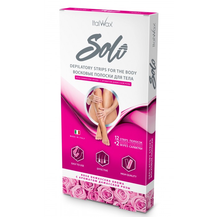 Восковые полоски ItalWax Solo безупречно удаляют волосы на теле, в деликатных зонах и на лице. Масло Дамасской розы питает и смягчает кожу во время депиляции, обладает приятным ароматом.