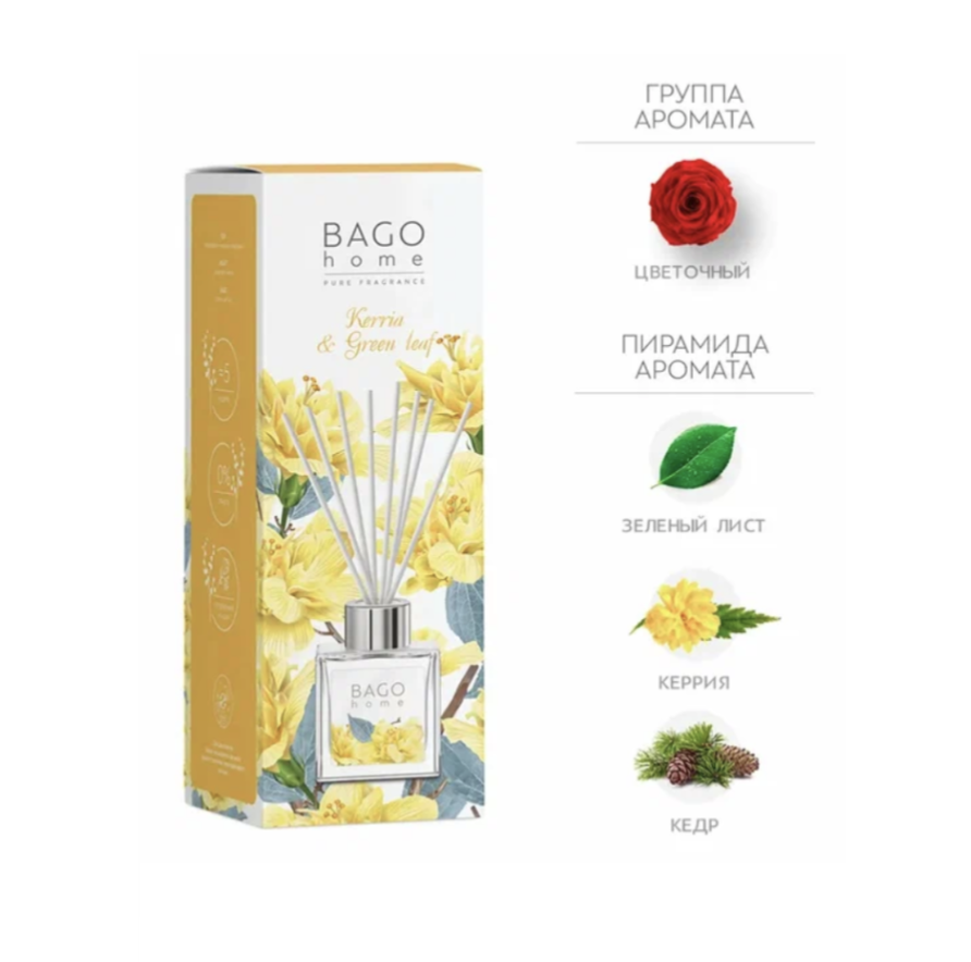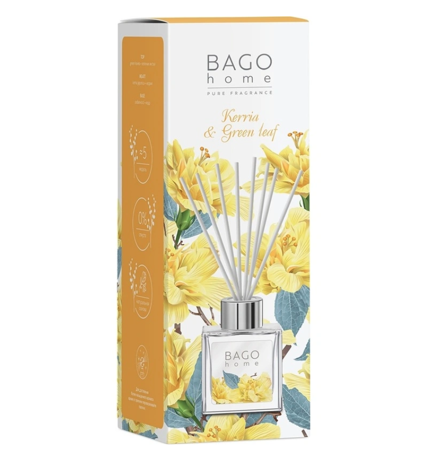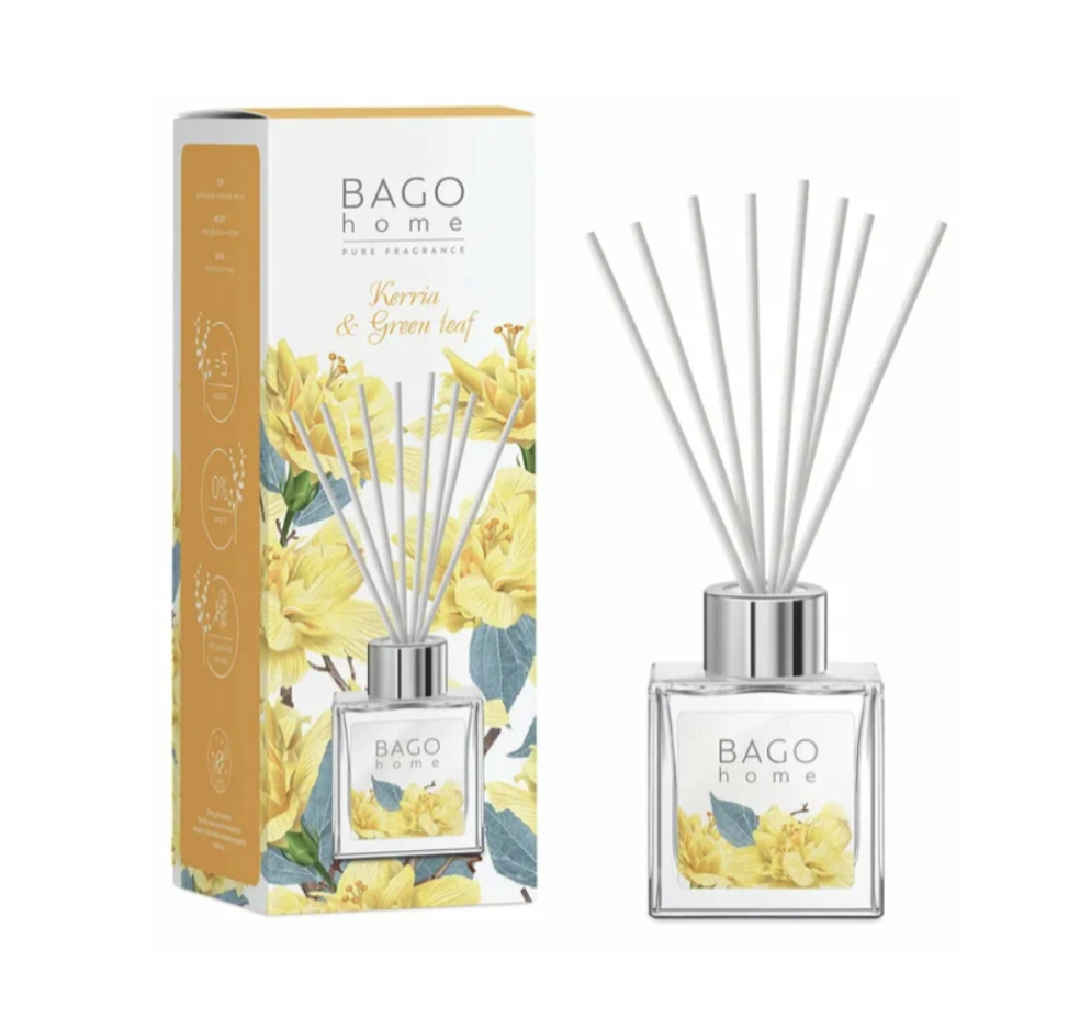 BAGO home Диффузор ароматический Керрия и зеленый лист - Свежий аромат душистых цветков керрии и зеленого листа на хвойно-древесной основе наполнит дом теплой прохладой первых весенних дней.