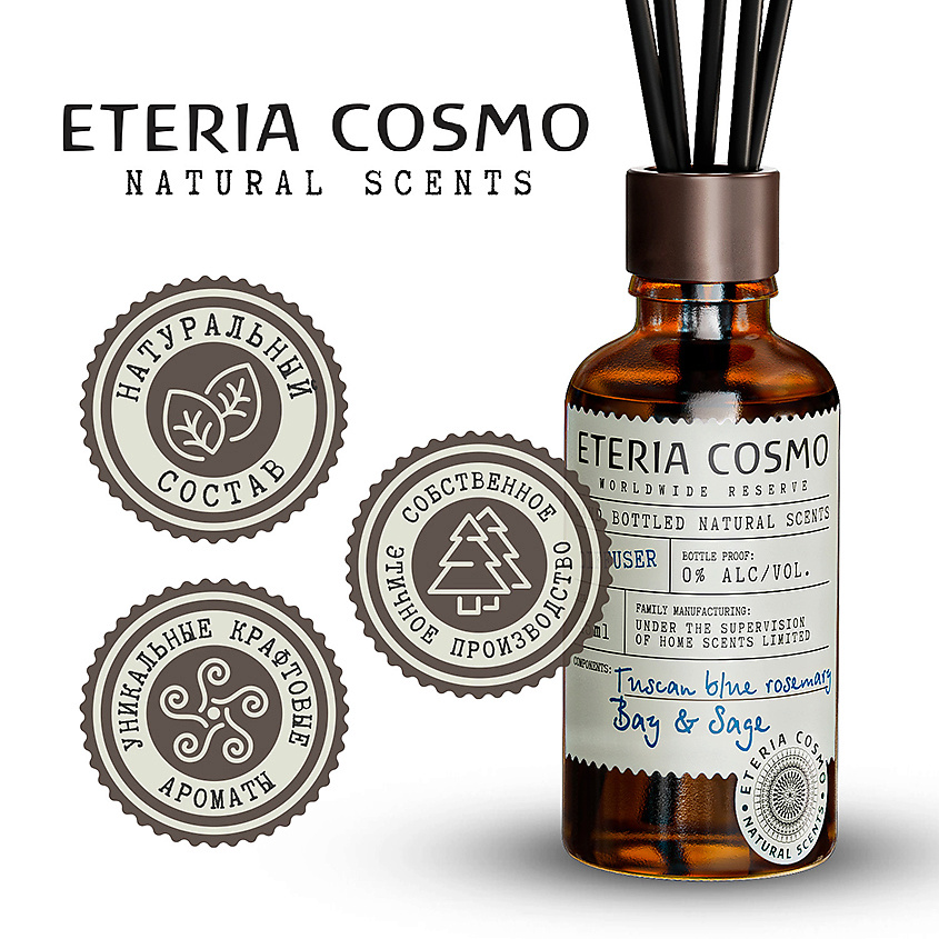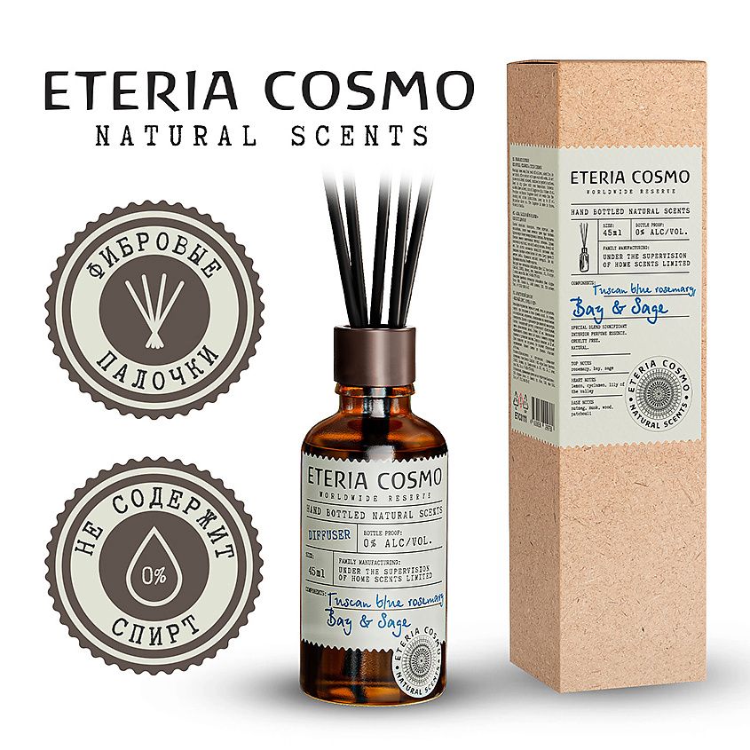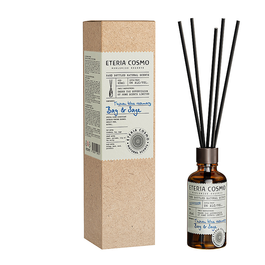 ETERIA COSMO Диффузор ароматический Розмарин лавр и шалфей - Свежий и бодрящий аромат розмарина переплетается с благородными нотами лавра, пряно-травяные акценты бархатистого шалфея, создают утонченную композицию, которая наполняет дом чистотой и освежает сознание.