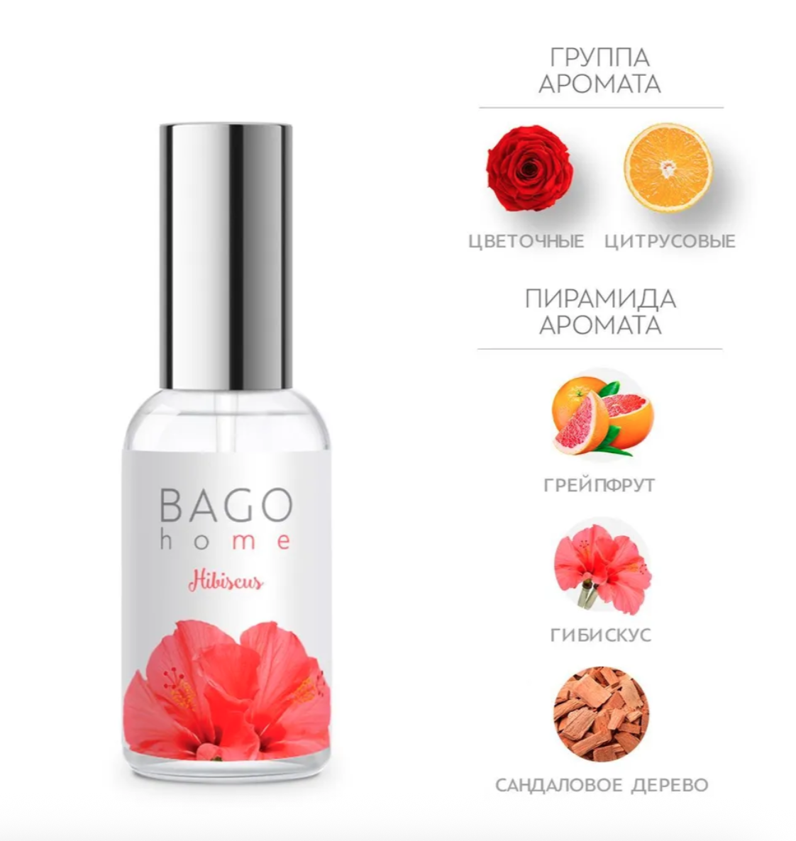 BAGO home Спрей ароматический Гибискус - Брызги сочного грейпфрута в сочетании с цветочными нотами гибискуса на основе сандалового дерева - залог бодрого начала дня.