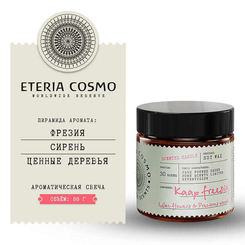 ETERIA COSMO Свеча ароматическая Фрезия, сирень и драгоценное дерево в стекле.