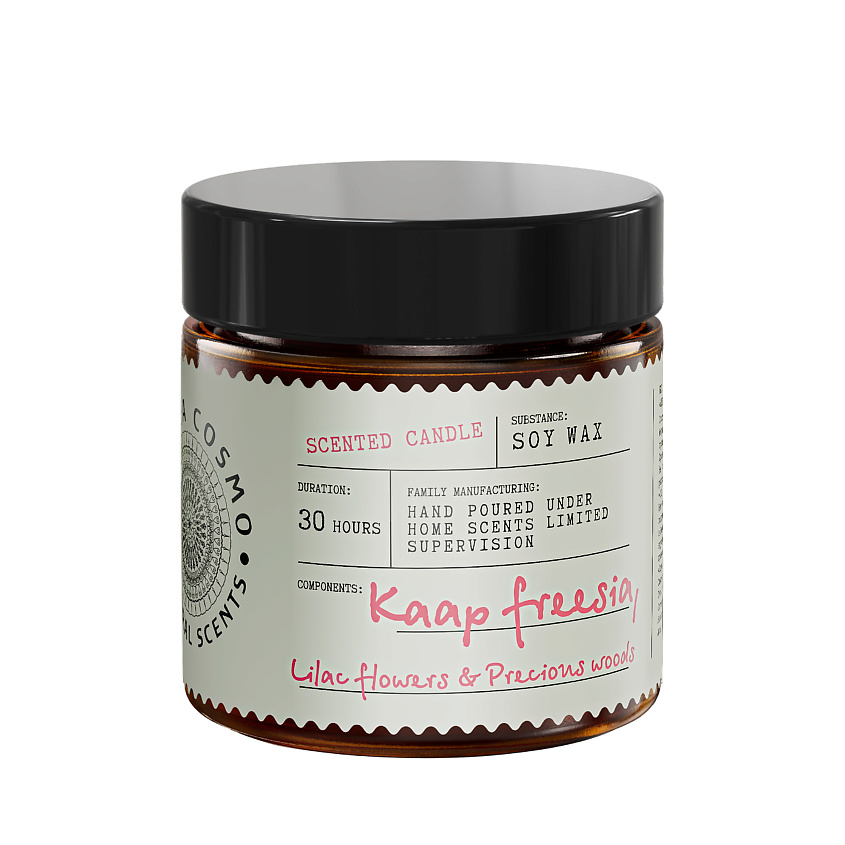 - Свеча ароматическая Фрезия, сирень и драгоценное дерево в стекле, 88 гр.