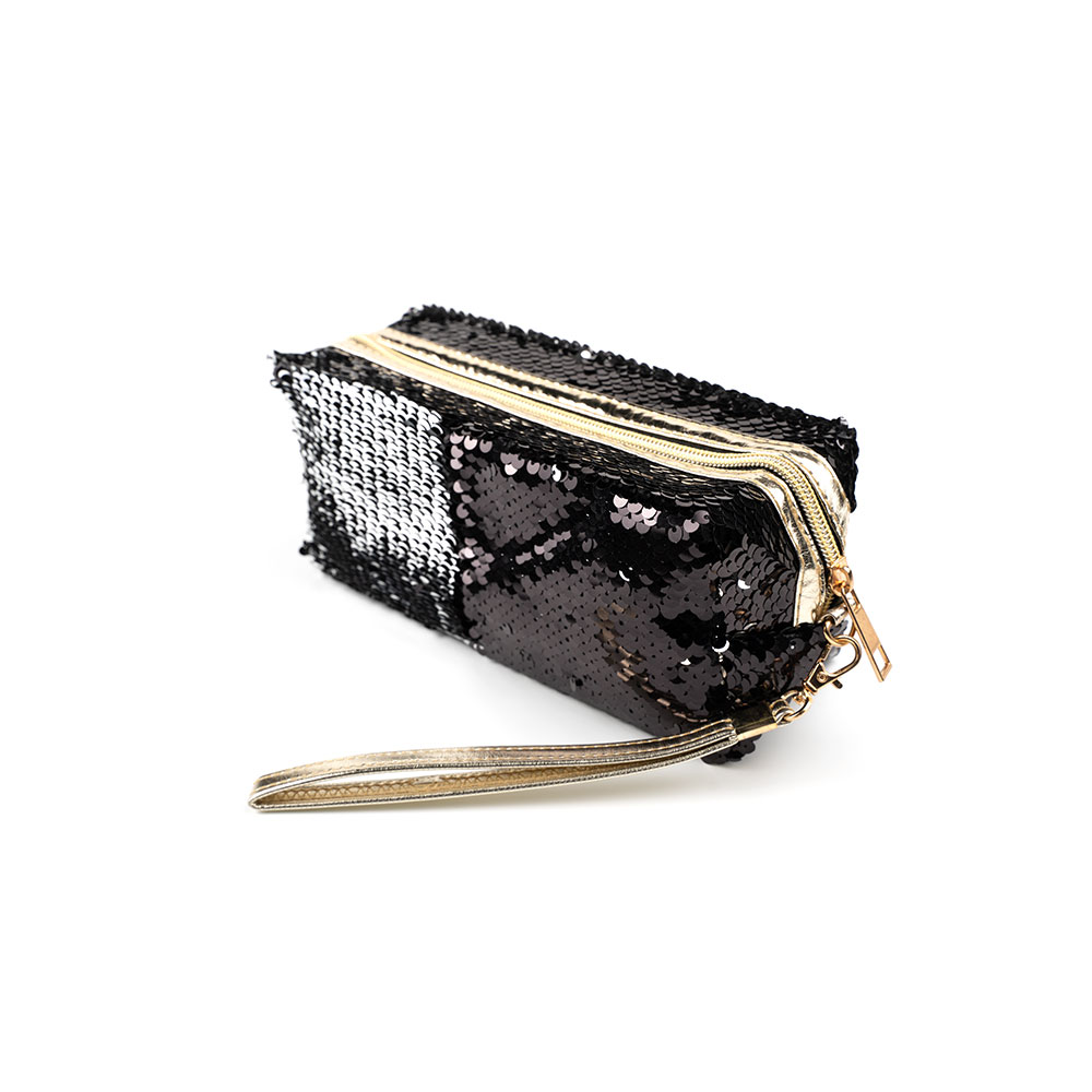 Вместительный и при этом компактный пенал на молнии предназначена для упорядочивания и удобного хранения аксессуаров, косметики, важных мелочей. Изготовлен из текстиля, декорирован разноцветными пайетками, которые можно перевернуть для изменения расцветки аксессуара.