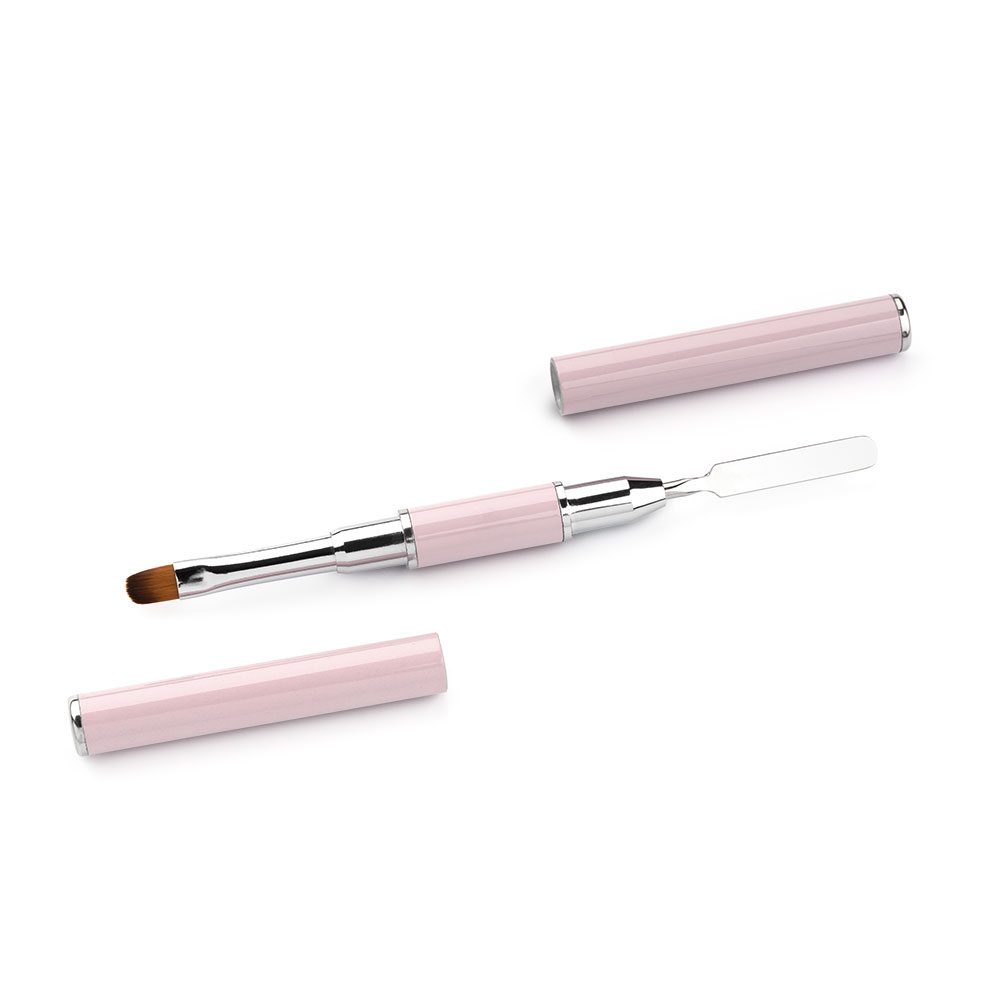 Представляет собой двухстороннюю кисть-шпатель для работы с акрил-гелем. Обе стороны кисти плотно закрываются колпачками. Данная кисть для акрил-геля намного облегчает работу мастера – не нужно иметь два отдельных инструмента для наращивания ногтей.