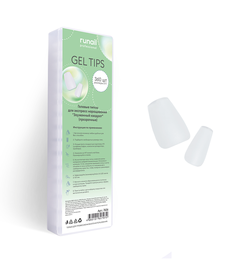 - 7626 RuNail Гелевые типсы Зауженный квадрат прозрачные, 360 шт.