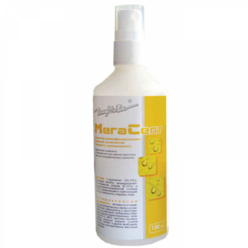 Дезинфицирующее средство МЕГАСЕПТ-спрей – представляет собой готовый к применению кожный антисептик в виде прозрачной жидкости от бесцветной до светло-желтого цвета со специфическим запахом.