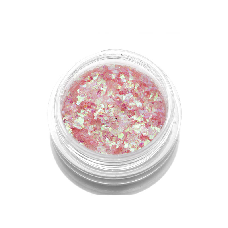 Представляет собой тонкие цветные пластинки или чешуйки напоминающие фольгу. Используется материал для декорирования ногтевой пластины. Слюда может стать как основным элементом в дизайне, так и ярким акцентом. Пластинки наносятся на липкий слой цвета, либо на закрепитель.