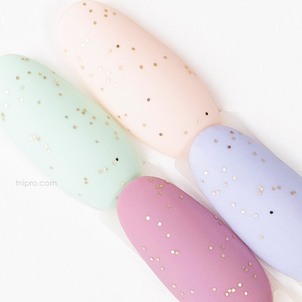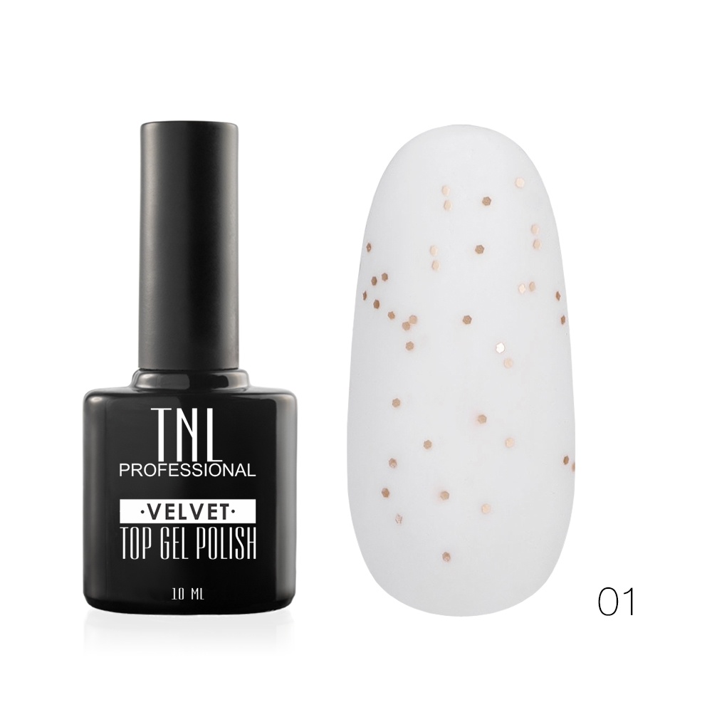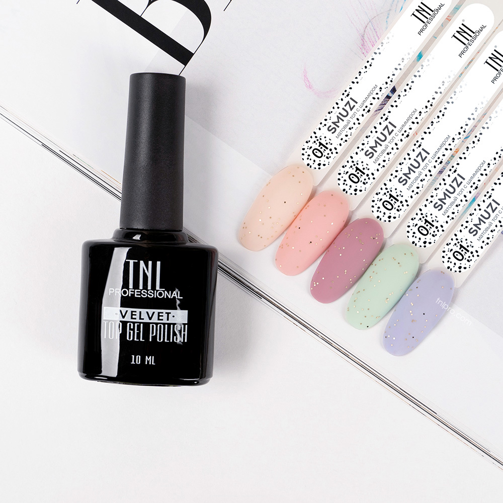 TNL Закрепитель для гель-лака матовый Smuzi №01 с блестками - уникальное финишное покрытие с бархатным эффектом и мельчайшими золотыми блестками для создания маникюра с узором перепелиных яиц.