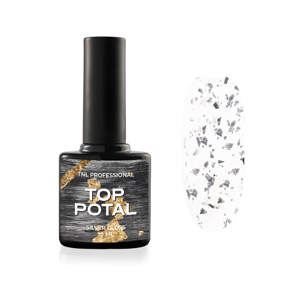 TNL Закрепитель для гель-лака Potal Серебро - без липкого слоя, средней консистенции, имеющий в своем составе частички мелкой фольги, придающей ногтям блеск драгоценного металла.