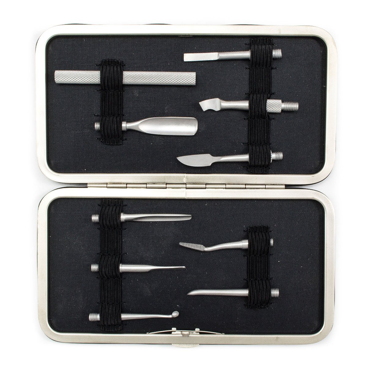 Набор содержит 9 насадок и одну рукоядку: Металлическая пилка или рашпиль. Предназначен для запиливания боковых сторон ногтя. Две лопатки с различными диаметрами для отодвигания кутикулы. Изогнутая пилка для удаления птеригия и тщательного очищения ногтевого плато под удобным углом. Две плоские лопатки с овальным и прямоугольным окончанием для аккуратного отодвигания кутикулы и очищения ногтевого ложа от птеригия. Чаще всего используются при педикюре. Ложечка для очищения ногтевого плато от птеригия. Чаще всего используется при педикюре. Топорики разных размеров для удаления птеригия.
