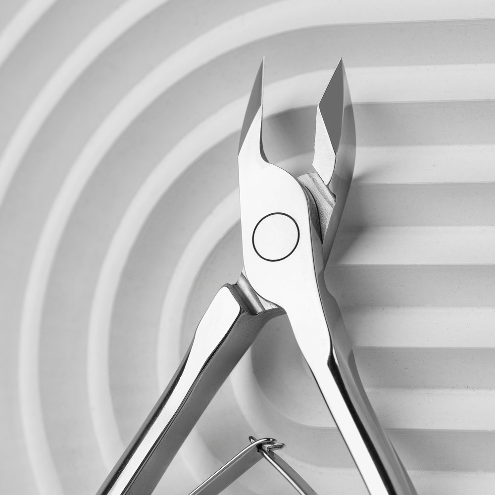 Прямые режущие части кусачек расположены под наклоном, присутствует «пяточка», за счет этого появляется возможность захвата большого участка кутикулы.