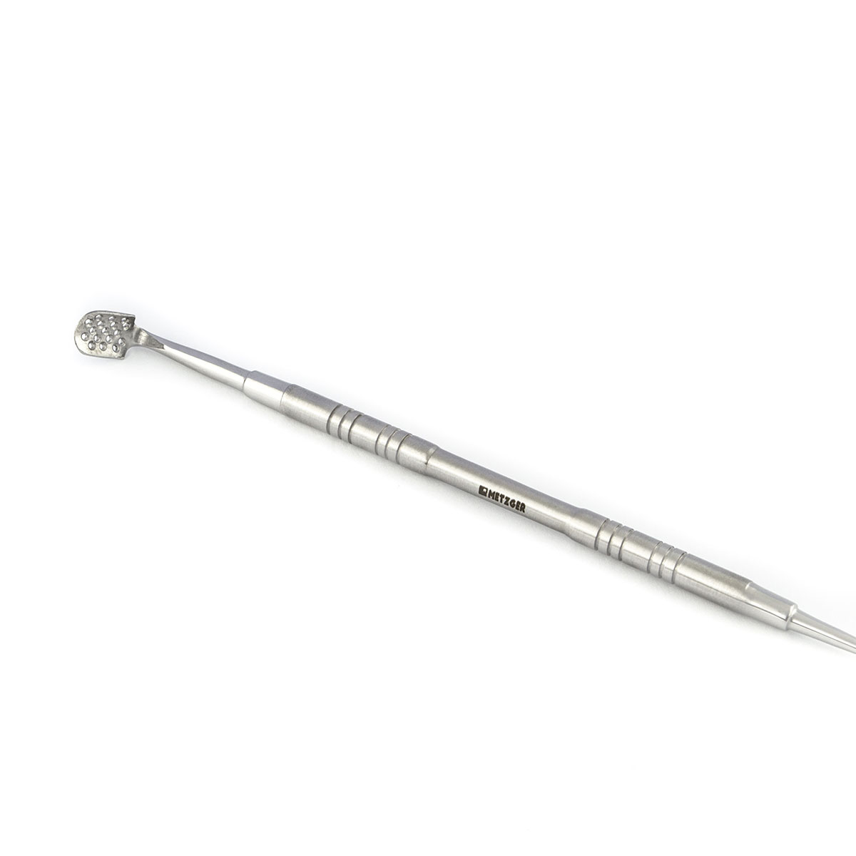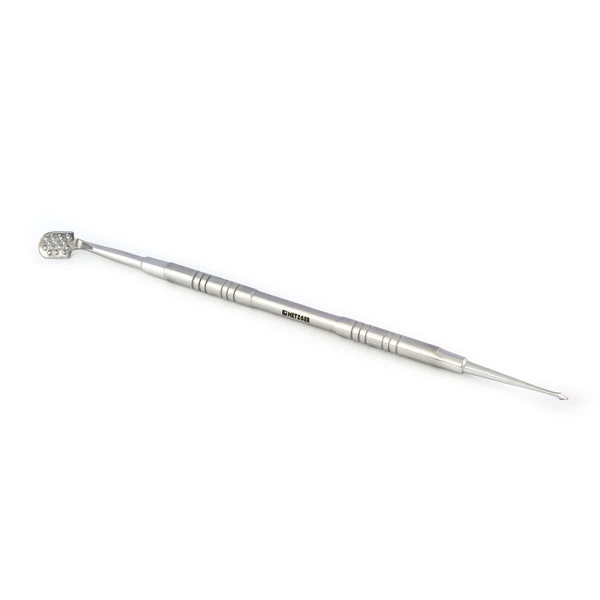 Из инструментальной нержавеющей стали с рифленой круглой ручкой. Представляет собой профессиональный двусторонний инструмент для косметологических процедур, где с одной стороны расположено остроконечное копье с хирургической заточкой для прецизионного вскрытия закрытых комедонов и милиумов, а с другой - перфорированная ложка диаметром с 17 микроотверстиями, расположенными в шахматном порядке для эффективного дренирования и вакуумной экстракции содержимого пор.