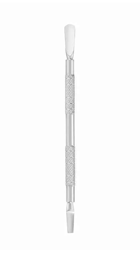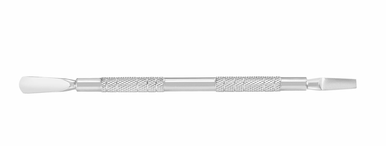 С широкой и плоской лопатками. Лопатка - предназначена для отодвигания кутикулы с целью дальнейшего удаления ножницами или кусачками. Плоская лопатка - хорошо подходит для очистки ногтя от птеригия и обработки поверхности у боковых валиков и внутренней стороны свободного края.
