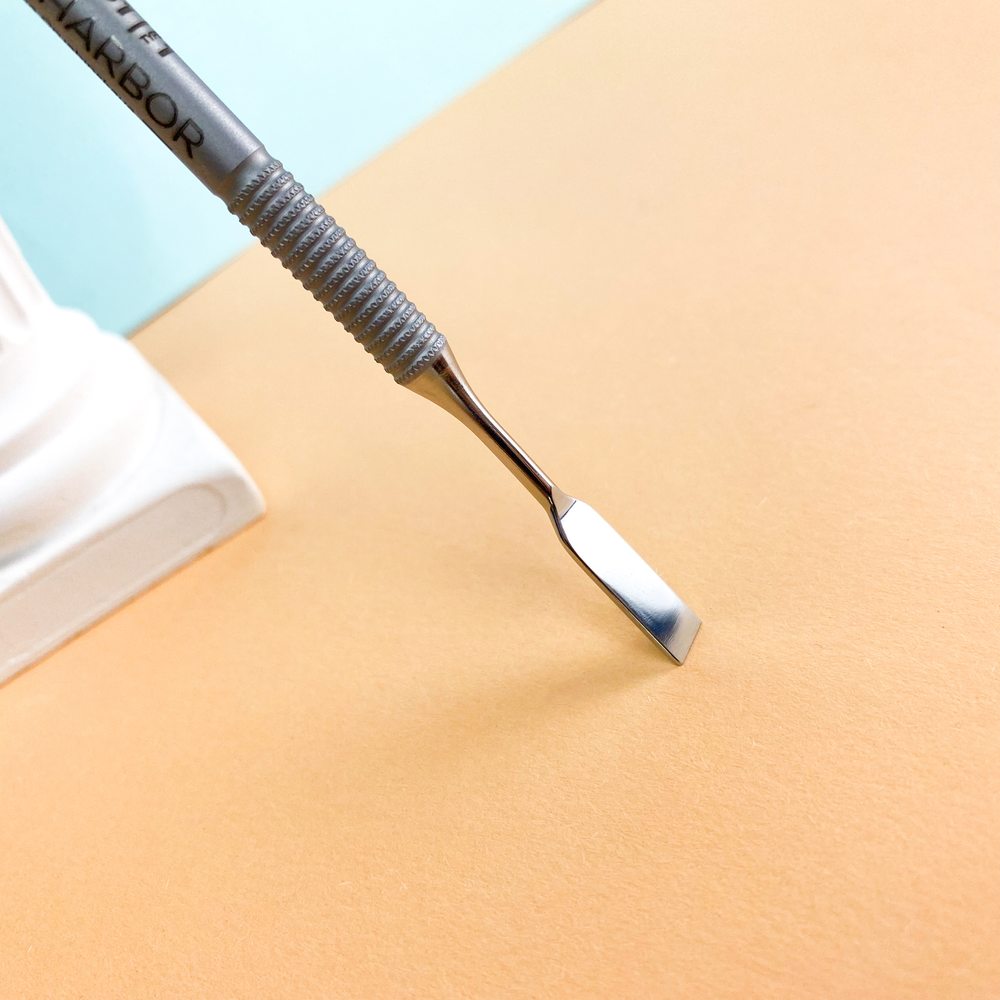 Прямоугольная часть лопатки предназначена для отодвигания тонкой и налипшей кутикулы, которая трудно поддается классическим круглым пушерам.