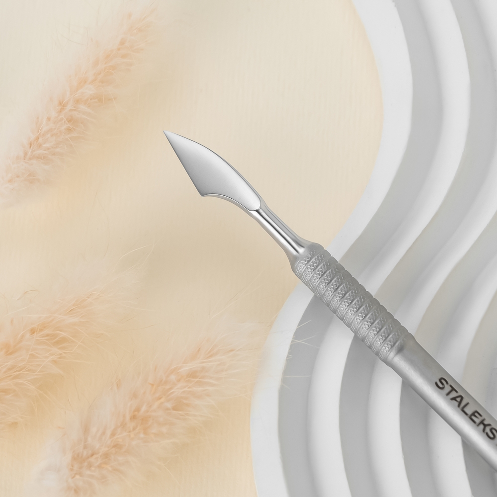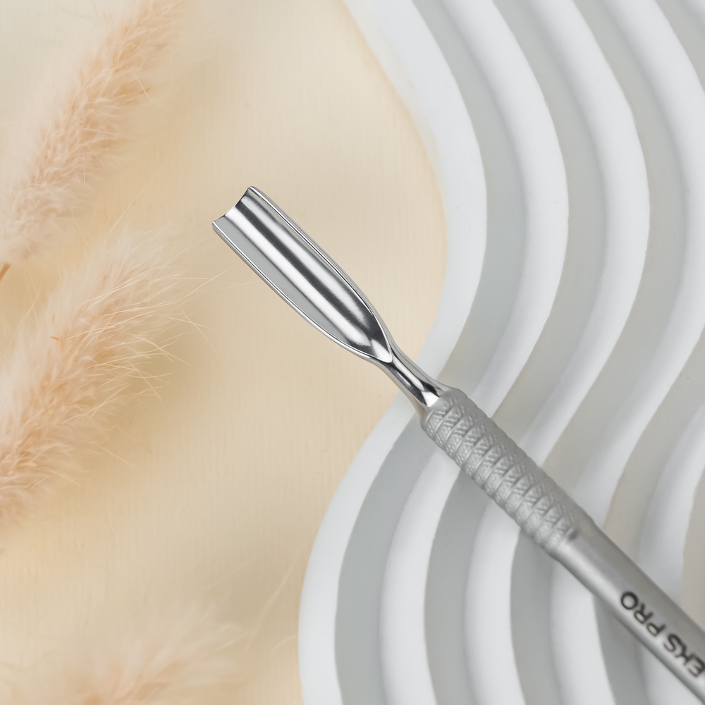Прямой внешний край пушера предназначен для обработки широкого основания ногтевого ложа. Изгиб лопатки точно повторяет форму ногтя и отодвигает нежную кожицу, не травмируя ногтевую пластину.