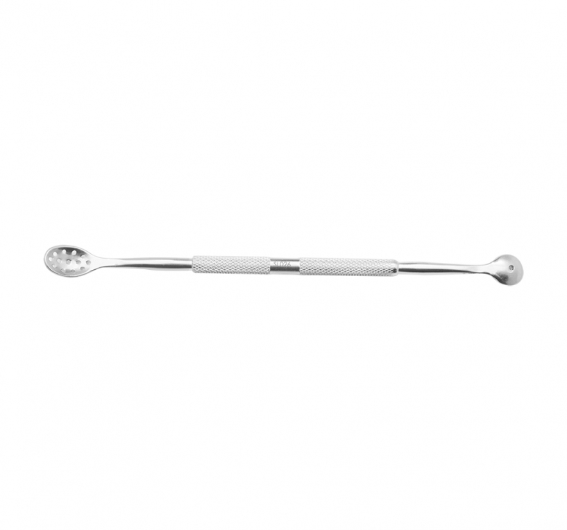 Для удаления прыщей. Рабочий край 1: ложка уно. Рабочий край 2: угревыдавливатель. Изготовлен из нержавеющей инструментальной стали.