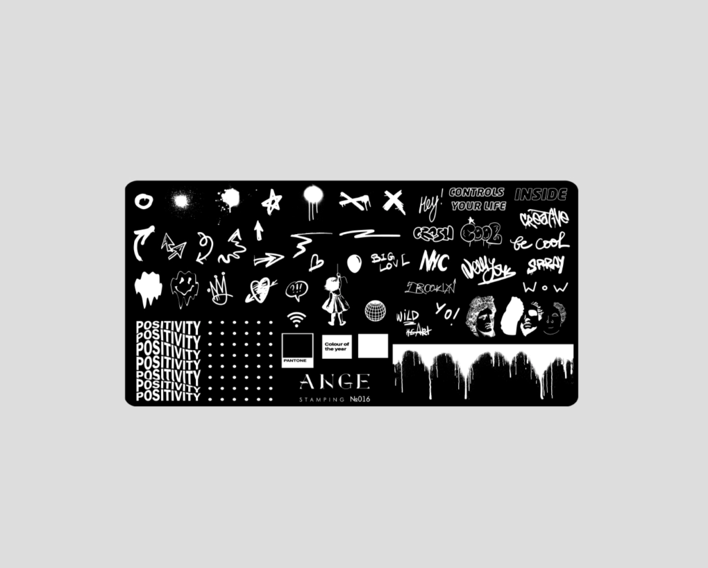 ANGE Пластина для стемпинга Стрит-Арт - имеет высокое качество гравировки рисунка, что позволяет без проблем переносить и отпечатывать даже самые маленькие изображения и тонкие линии.