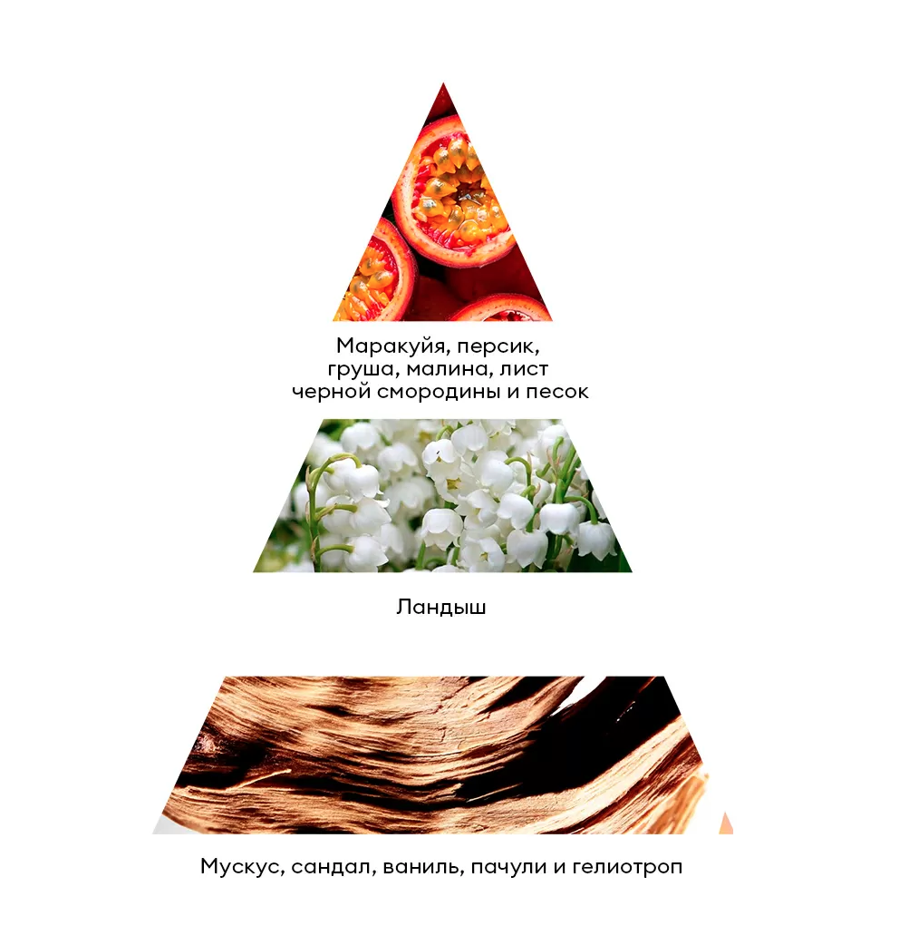 Он открывается сочными нотами маракуйи, персика, малины и чёрной смородины, дополненными аккордами мускуса, гелиотропа, сандала, пачули и ванили, которые создают глубокий и обволакивающий шлейф.