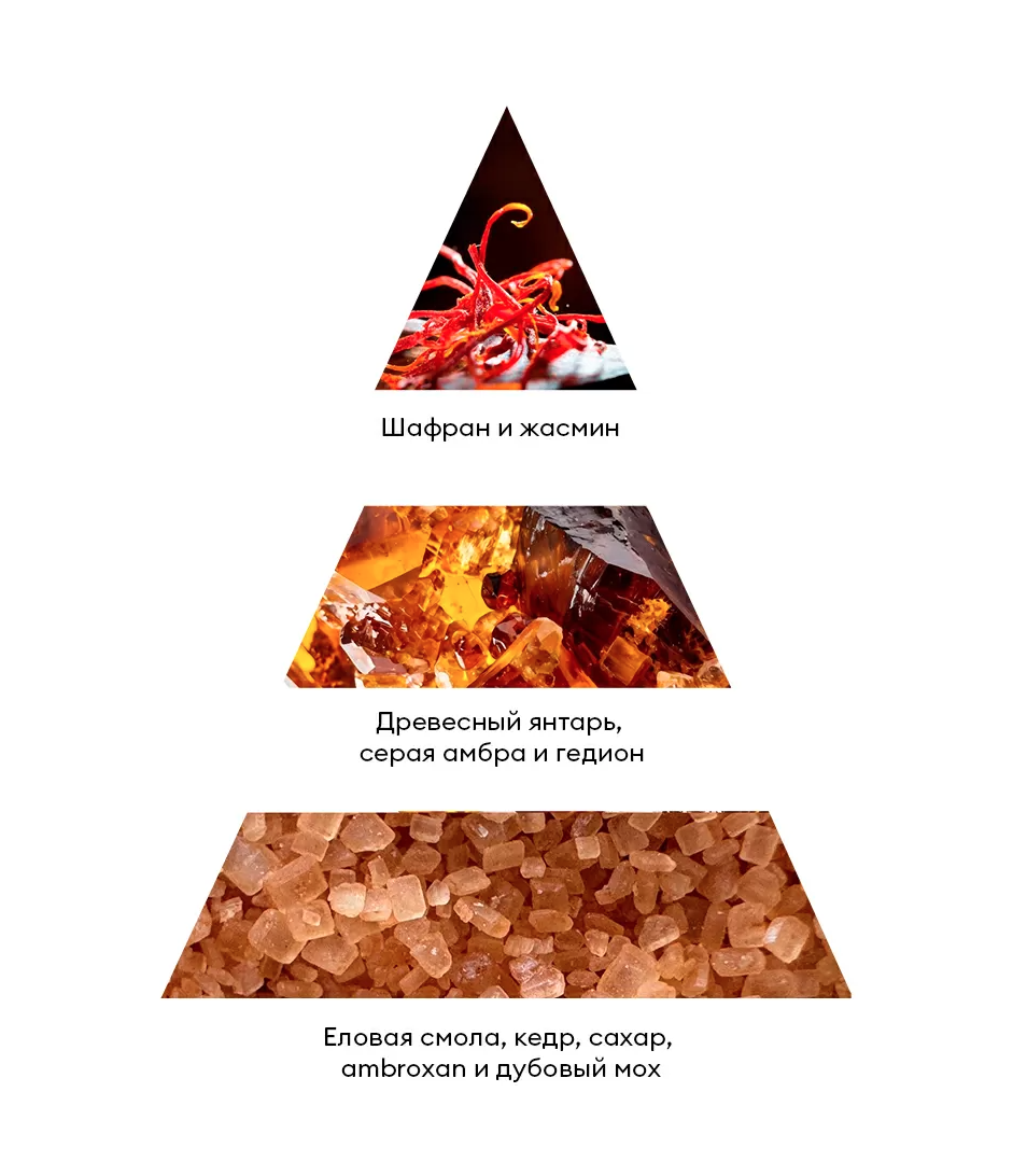 В сердце аромата звучит древесный янтарь, добавляющий мягкости и глубины.