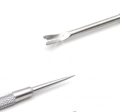Изготовлен из высокопрочной нержавеющей стали, устойчив к износу и всем видам стерилизации. Предназначен для работы с декоративными элементами при создании дизайнов, а также с гелями-пластилинами. Рифлёная поверхность ручки препятствует скольжению инструмента в руках.