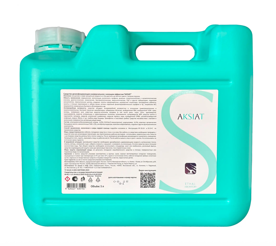 AKSIAT Средство дезинфицирующее универсальное с моющим эффектом - представляет собой концентрат в виде прозрачной жидкости от бесцветного до желтого цвета, предназначено для проведения профилактической, текущей и заключительной дезинфекции.