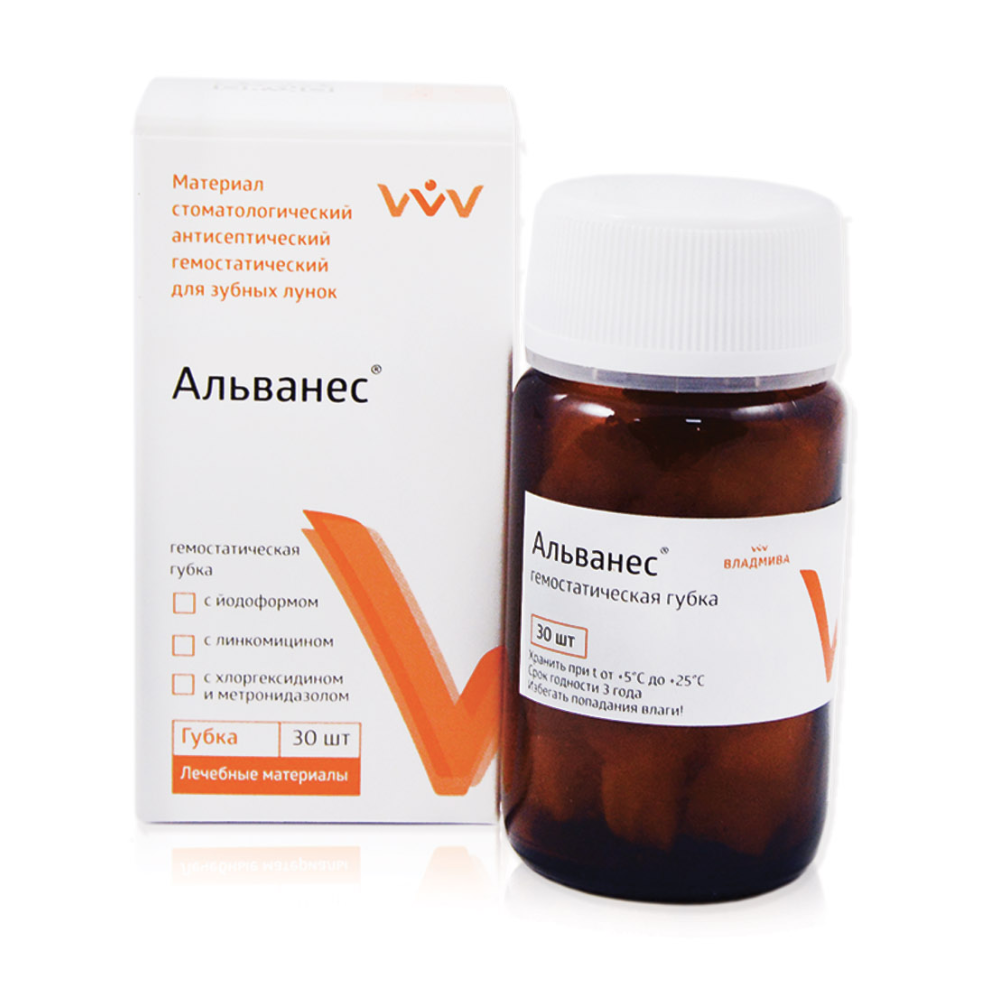 Кровоостанавливающая антисептическая коллагеновая губка «Альванес». Предназначена для лечения и профилактики воспалительных осложнений в хирургической стоматологии и пародонтологии: после удаления зубов, в частности лечение альвеолита и пародонтальных абсцессов; а также заполнение пародонтальных карманов после местной противовоспалительной терапии или кюретажа.
