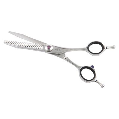 Ножницы Yoshimoto. Серия «Diamond». Длина 6" 21 зубец Японская сталь 440С Кобальтовое покрытие Ручная заточка Заточка CONVEX под углом 38º 2 V-образных полотна. Для легкого среза. Одинаково хорошо стригут сухие и влажные волосы. Классическая форма Регулировочный винт Съёмные кольца-вкладыши 2 съёмные опоры для пальцев