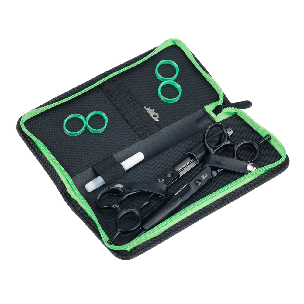 Ножницы имеют конвекционную заточку с углом 42°, твердость по Роквелу 55-57 HRC, дополнительные сменные кольца салатового цвета.