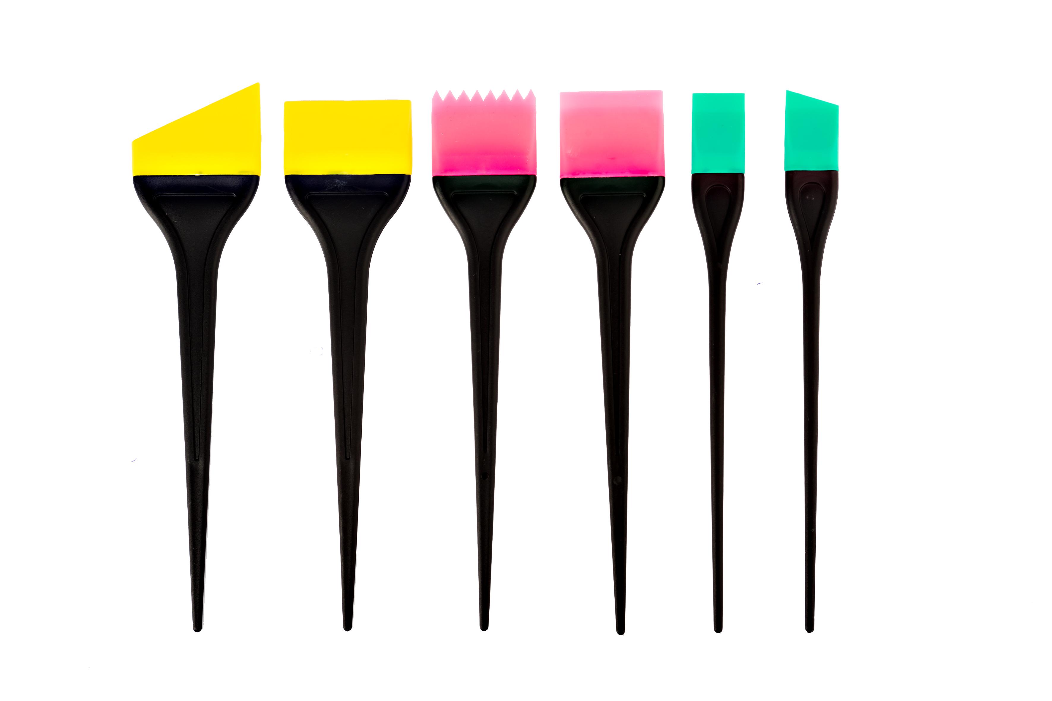 Удобные силиконовые кисти в наборе из 6 штук, станут незаменимыми инструментами в покраске волос. Разнообразие форм рабочей части кистей позволит подобрать именно такую, которая необходима для окрашивания данного участка волос.