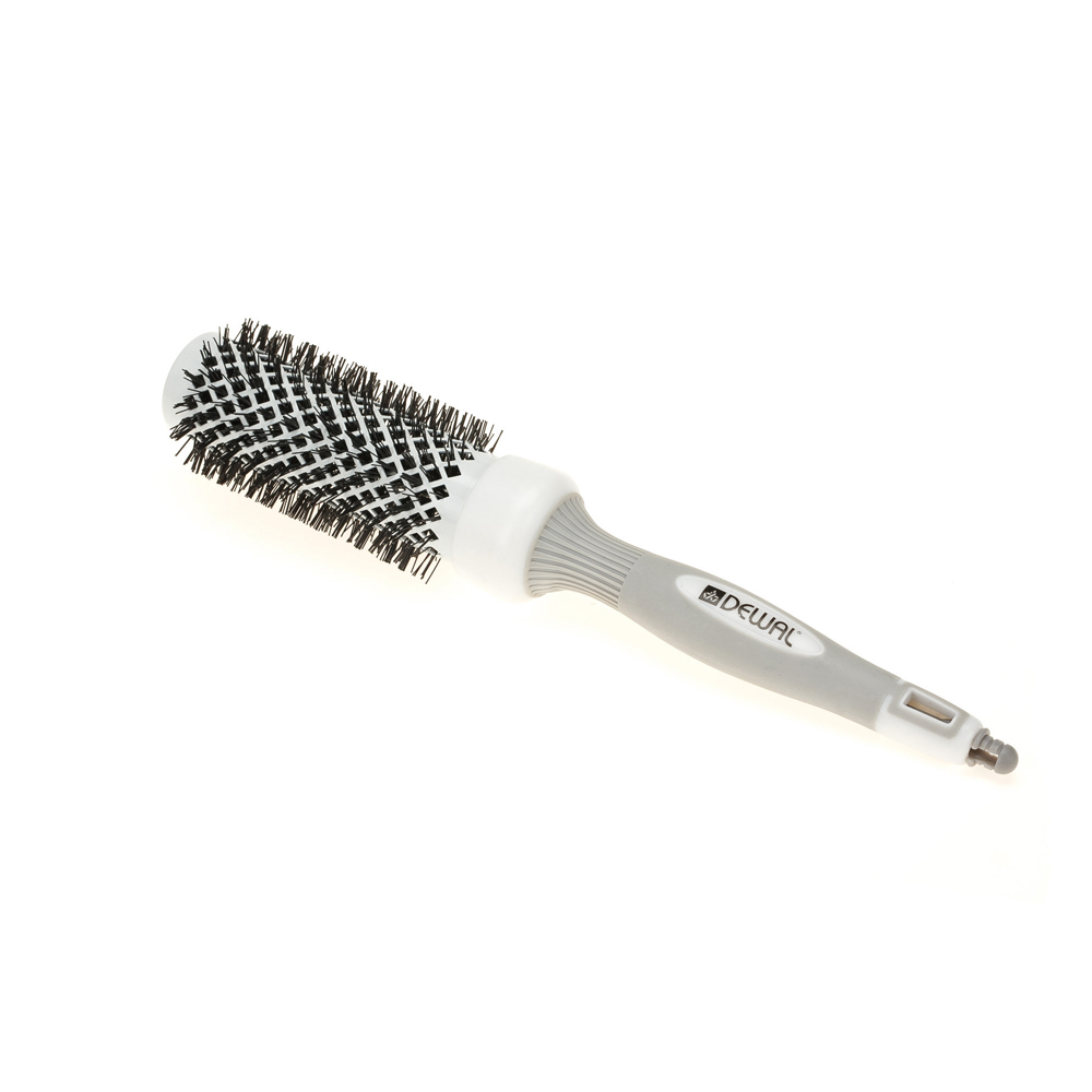 Прорезиненная ручка с хвостиком для отделения прядей. Керамическое покрытие. Нейлоновая щетина. Внутренний диаметр 33 мм, внешний диаметр 48 мм.
