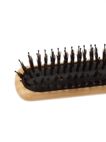Ручка из бамбука. Антибактериальная и водоотталкивающая поверхность. Пластиковые зубцы на подушке. С помощью такой расчески сушка становится быстрой и легкой.