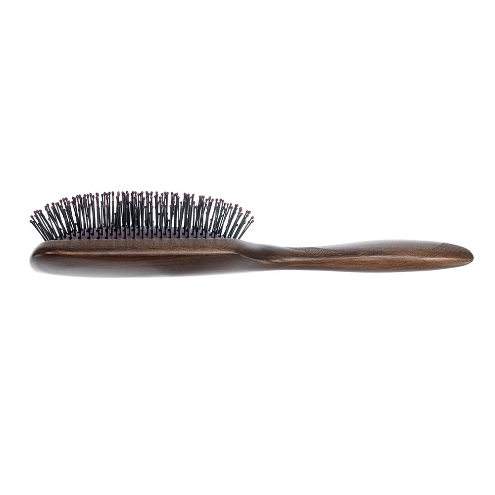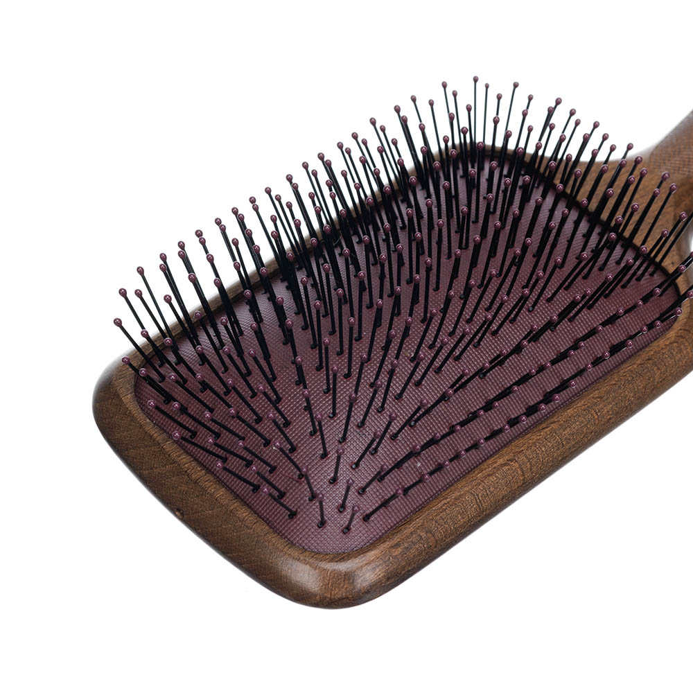 Натуральное дерево по-прежнему остается самым модным и любимым среди профессиональных парикмахеров. Щетка в которой сочетаются стиль и классика. Лазерная дизайнерская гравировка, точно расположена вдоль линии ручки, для противоскользящего эффекта. Комбинированные штифты, для лучшего расчесывания и полировки волос.