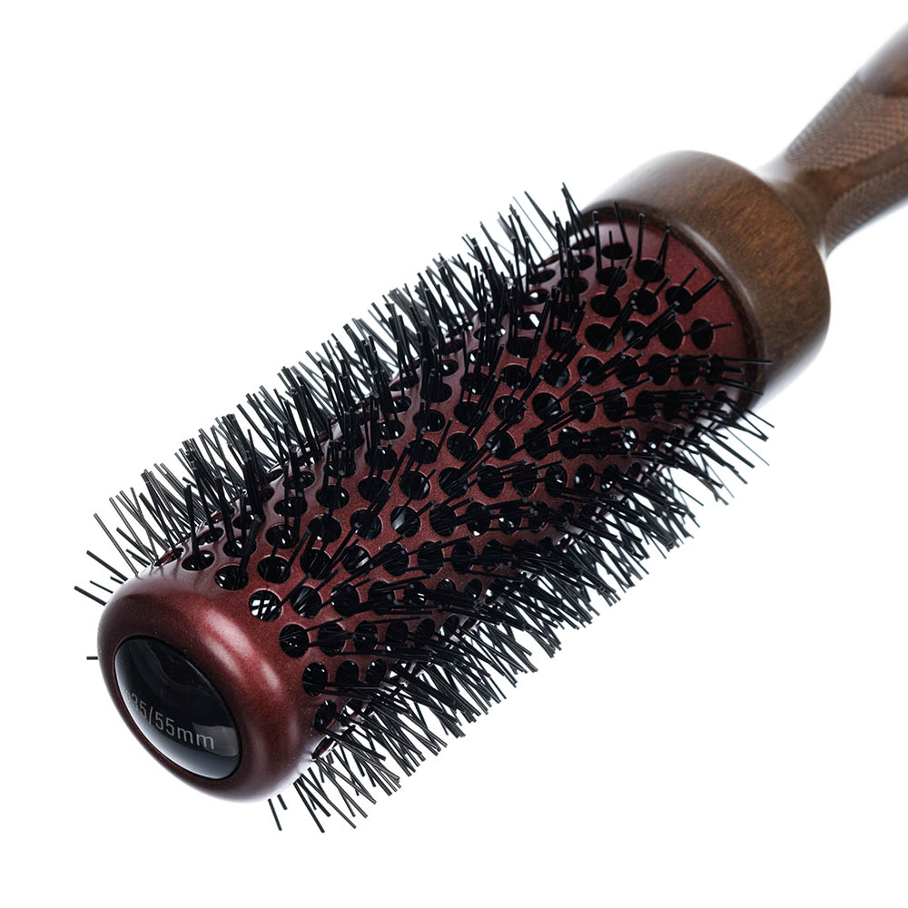 Натуральное дерево по-прежнему остается самой модной и любимой среди профессиональных парикмахеров. Термобрашинг, в котором сочетаются стиль и классика. Лазерная дизайнерская гравировка, точно расположена вокруг основания рабочей поверхности термобрашинга, для противоскользящего эффекта. Керамическое покрытие, равномерно нагревается и не сушит волосы во время укладки.
