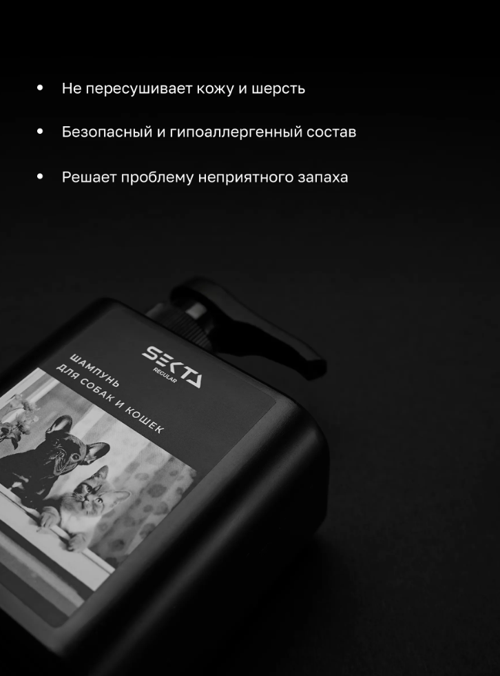 Hair Sekta Шампунь для собак и кошек - эффективно очищает шерстный покров вашего питомца от любых загрязнений, не пересушивая кожу и шерсть.