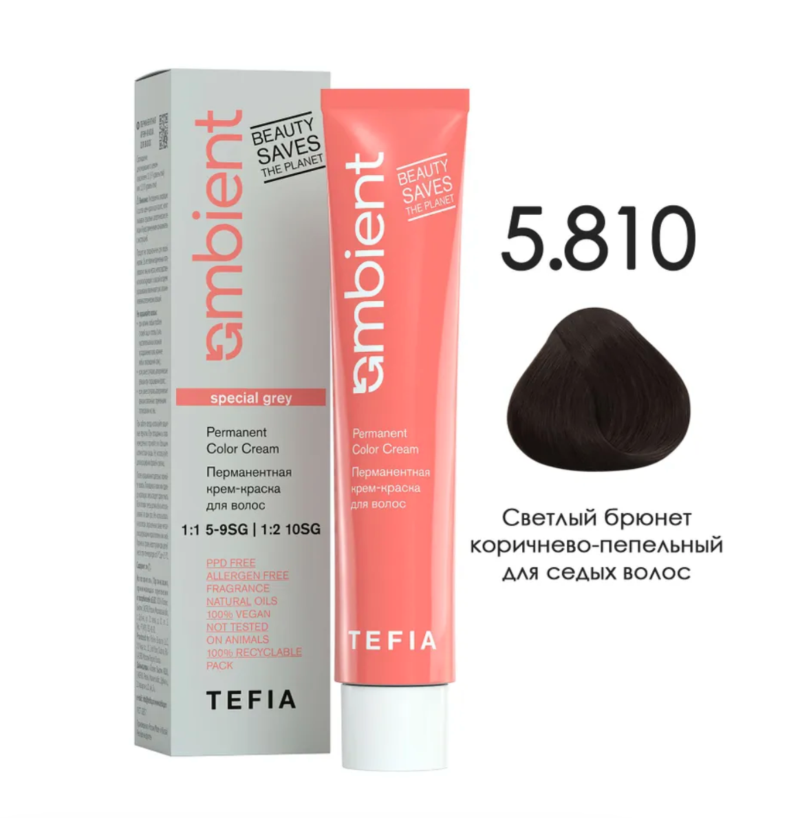 - TEFIA AMB Крем-краска 5.810 Светлый брюнет коричнево-пепельный для седых волос, 60 мл.