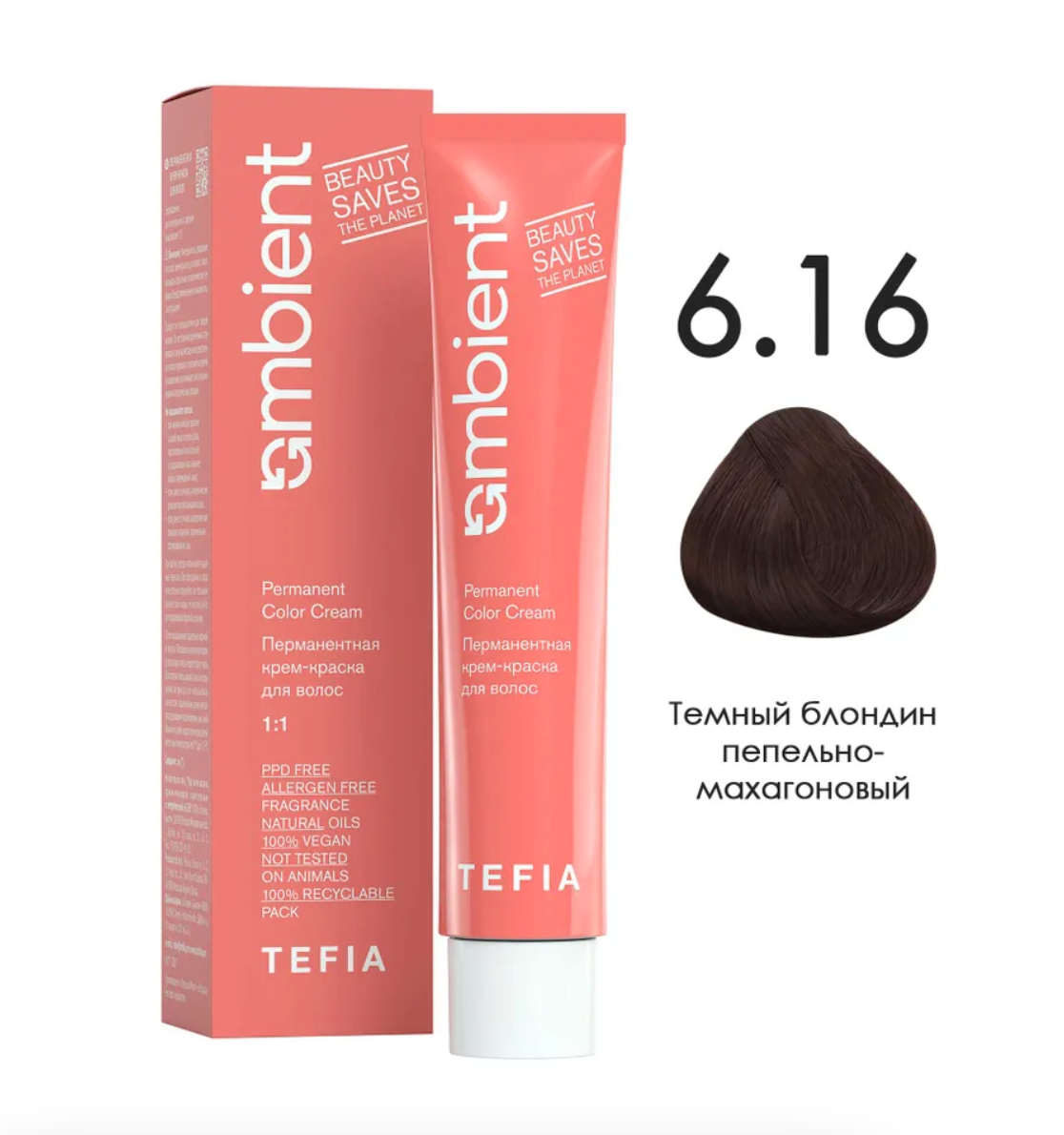 - TEFIA AMB Крем-краска 6.16 Темный блондин пепельно-махагоновый, 60 мл.