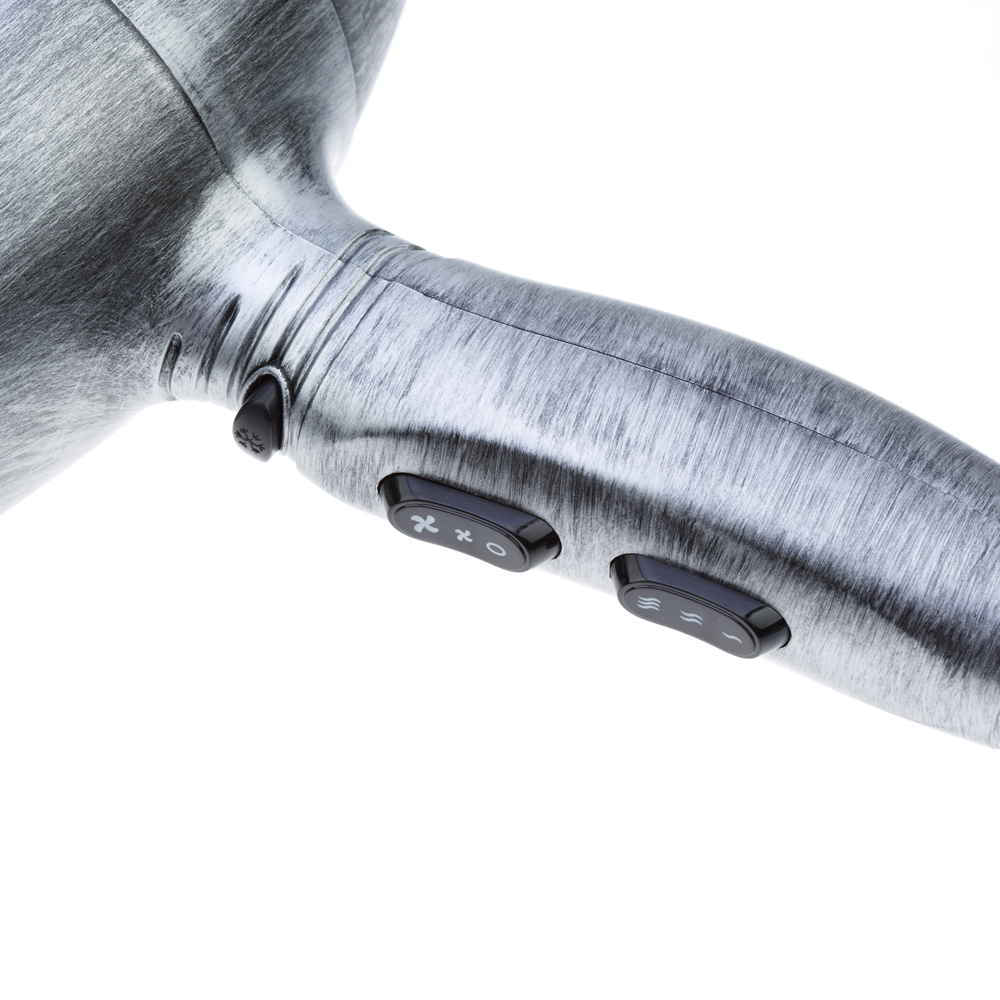 Стильное матовое покрытие корпуса, имитирующее сталь. Обладает маневренностью и большой мощностью и поэтому идеально подходит для работы в салоне. Благодаря универсальному размеру фен подходит как для женской, так и для мужской руки. Ручка фена немного отклонена назад, что улучшает эргономику при работе.