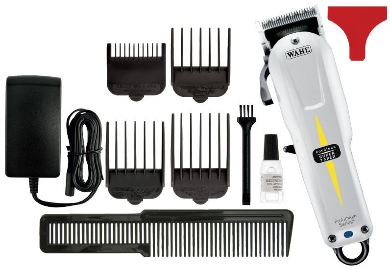 В комплекте с Wahl Super Taper Cordless вы получите: 4 пластиковые насадки [#1 (3 мм), #2 (6 мм), #3 (9 мм), #4 (12 мм)], зарядное устройство, адаптер, масло, щетка для чистки, инструкция.
