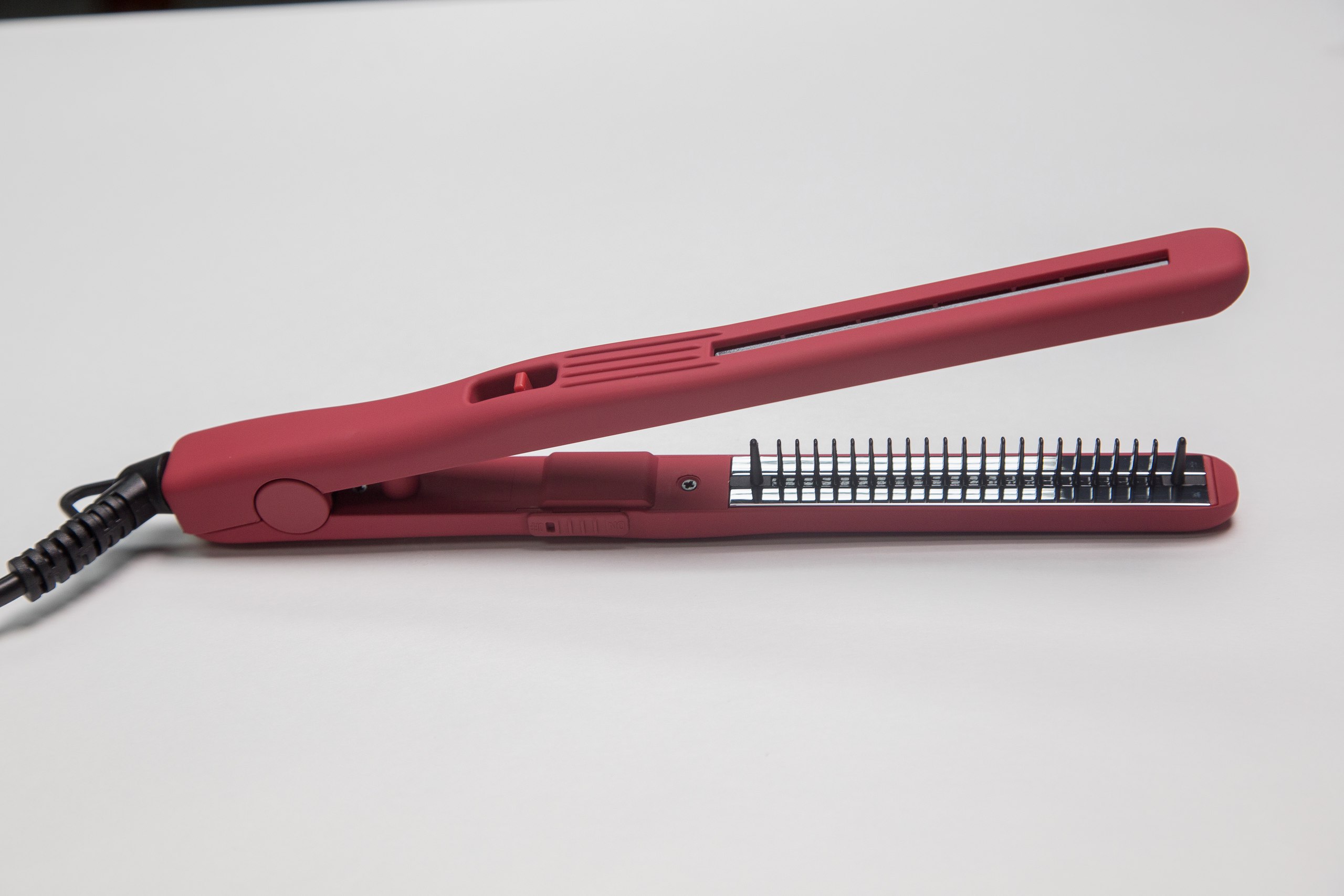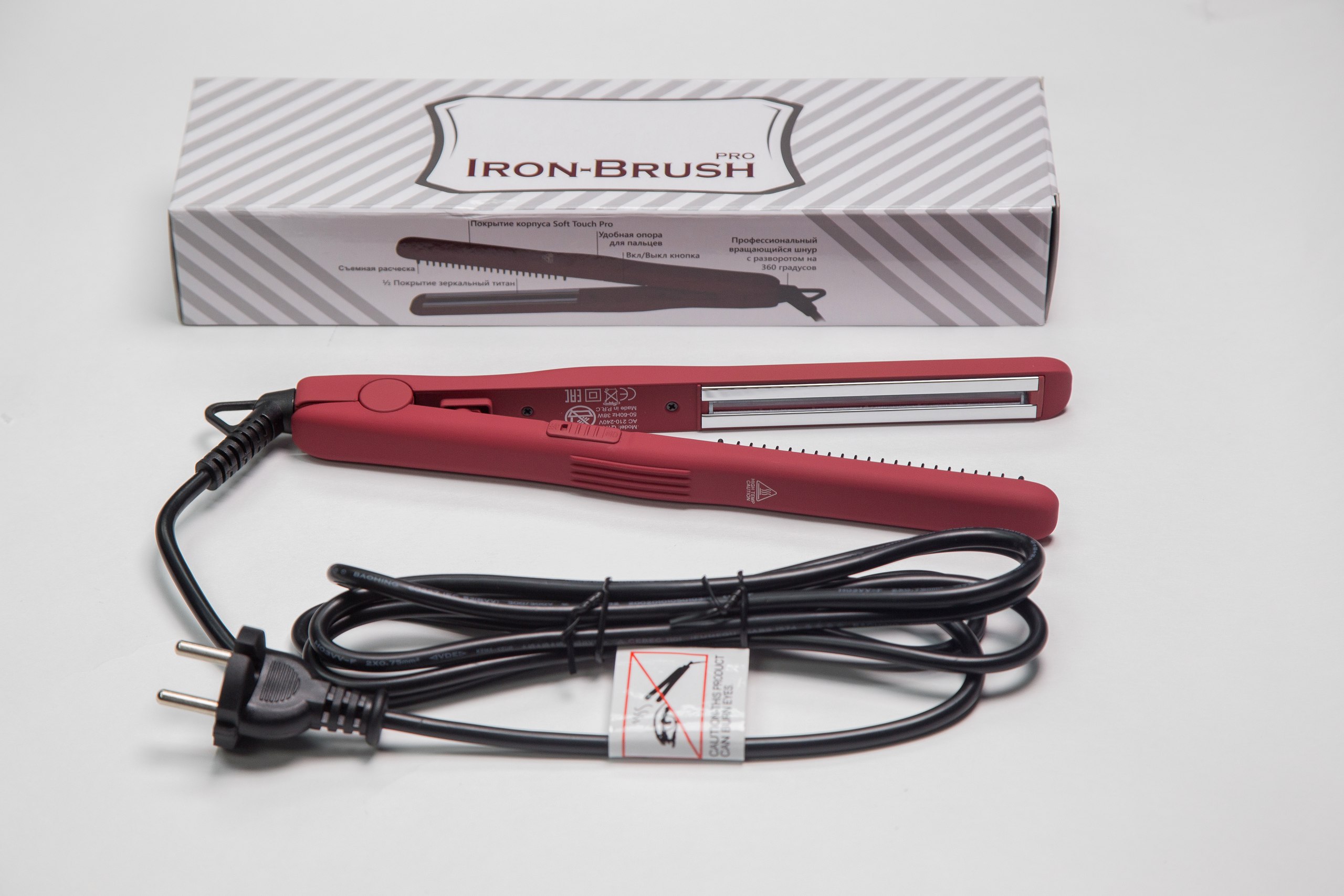 Длина утюжка - 25 см. Длина рабочей поверхности пластин утюжка - 11 см. Ширина пластин - 1,8 см. Расческа с турмалиновым покрытием. Покрытие корпуса Soft Touch Pro. Кнопка фиксации полотен. Зеркальное титановое покрытие расчески-утюжка обеспечивает равномерный нагрев и качественное скольжение. Подходит для укладки волос коротких и средних, а так же для укладки усов и бороды.