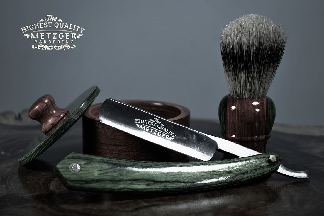 На лезвии выгравирован золотой краской логотип «Metzger Barbering». Рукоять выполнена в оранжево-зеленых цветах.