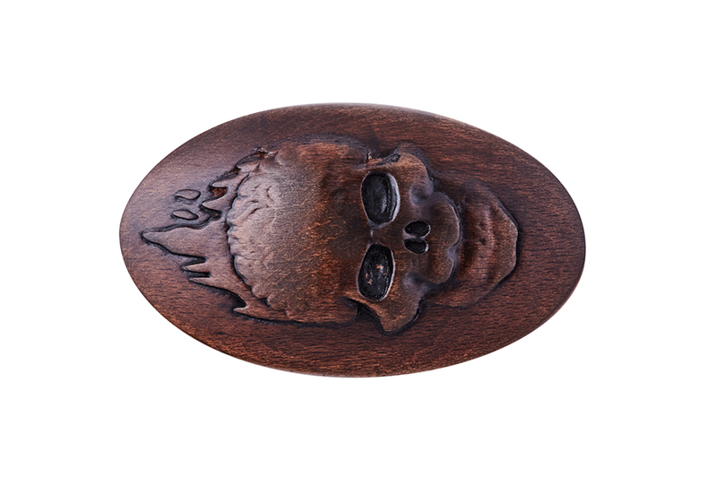Окрашена в темный цвет и украшена оригинальным рельефным изображением черепа.