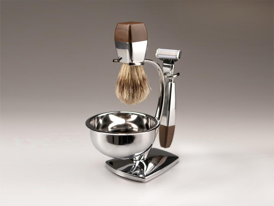 Набор для бритья включает следующие предметы: Станок для бритья, совместимый с кассетами Mach3, Бритвенный помазок из натурального щипанного барсучьего ворса, Хромированная чаша на магнитной подставке, Удобная и компактная подставка из хрома.