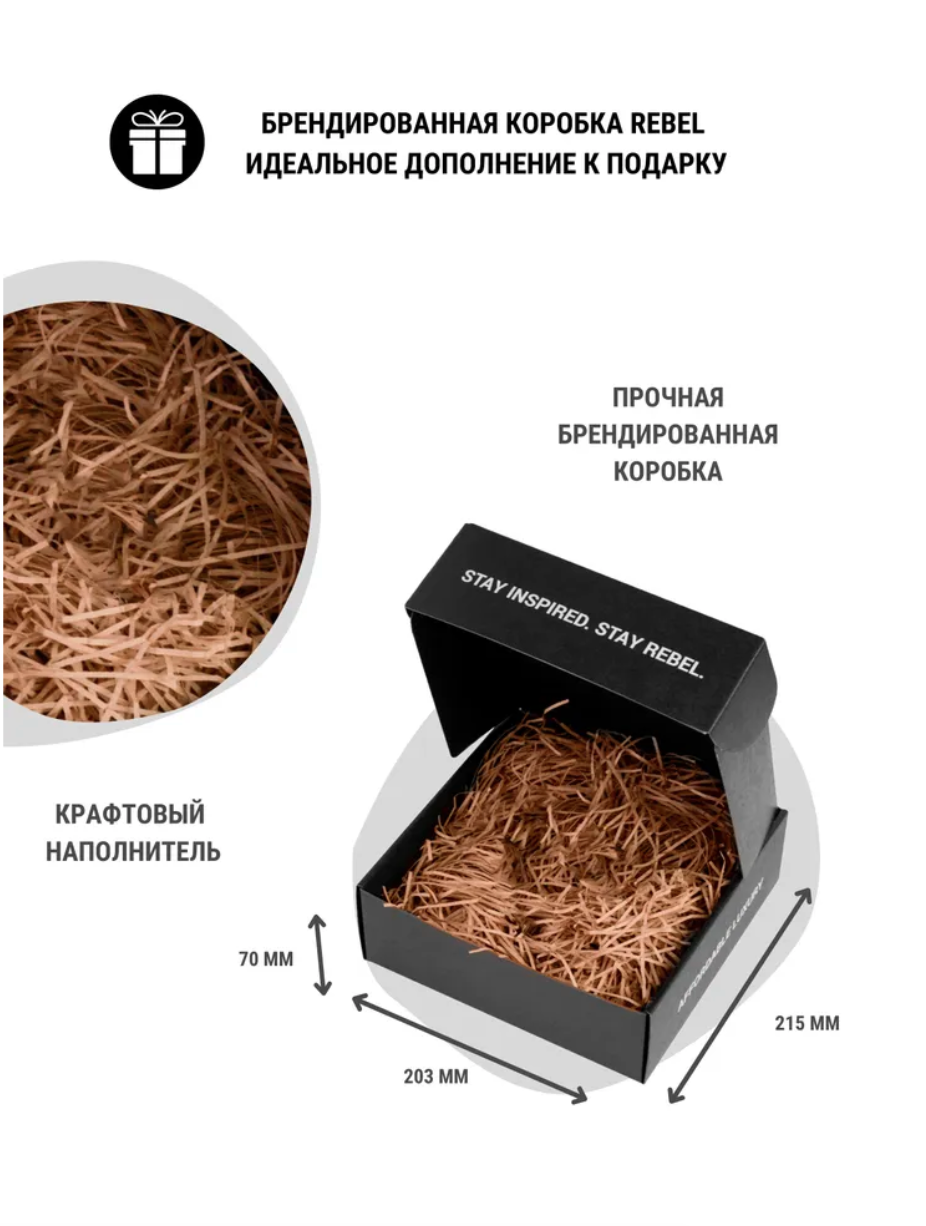 Изготовлена из плотного картона высшего качества, поставляется уже в собранном виде, содержит крафтовый наполнитель. Черная минималистичная коробка с логотипом идеально вместит в себя набор из продуктов Rebel.