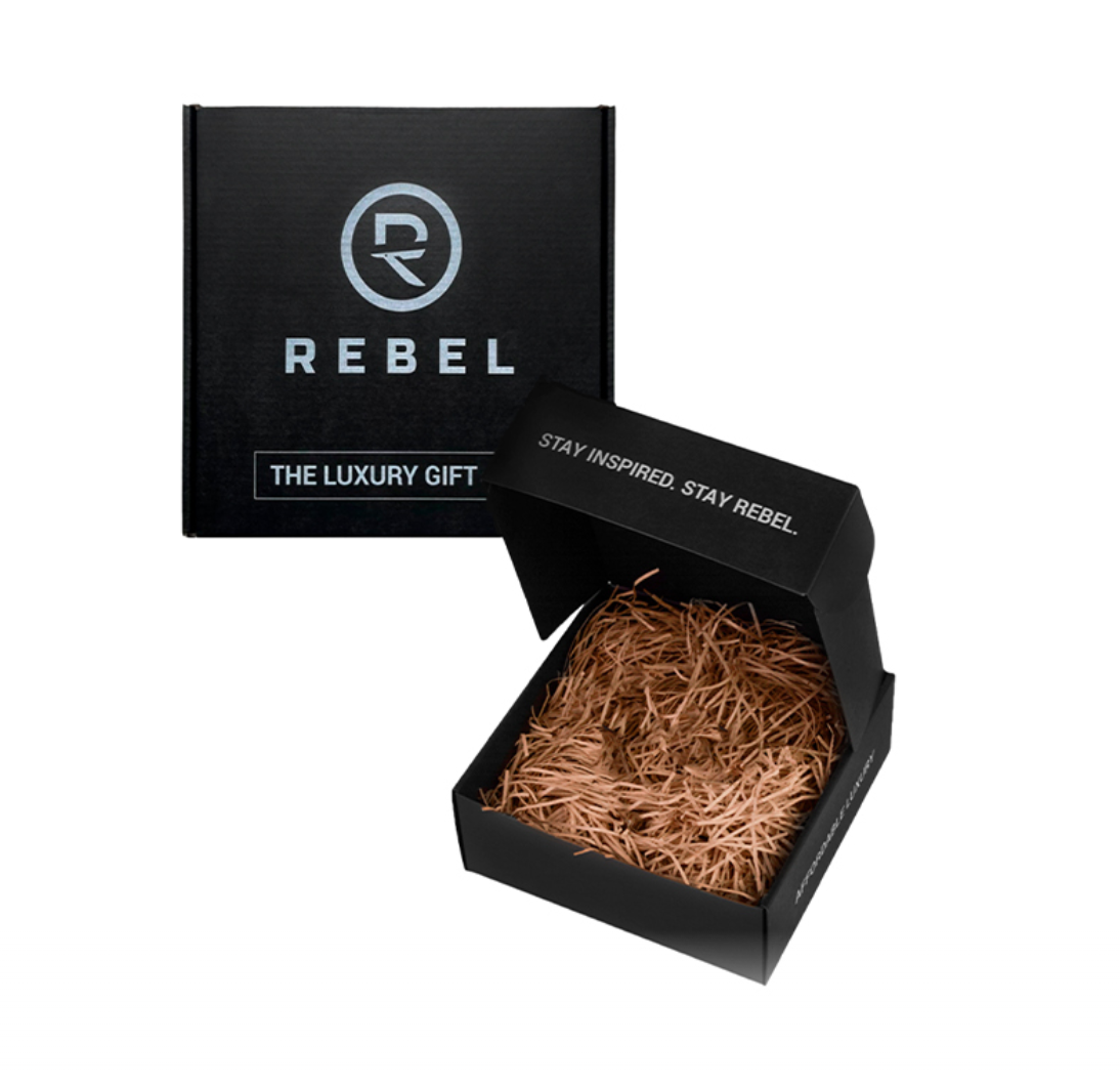 Черная минималистичная коробка с логотипом идеально вместит в себя набор из продуктов Rebel.