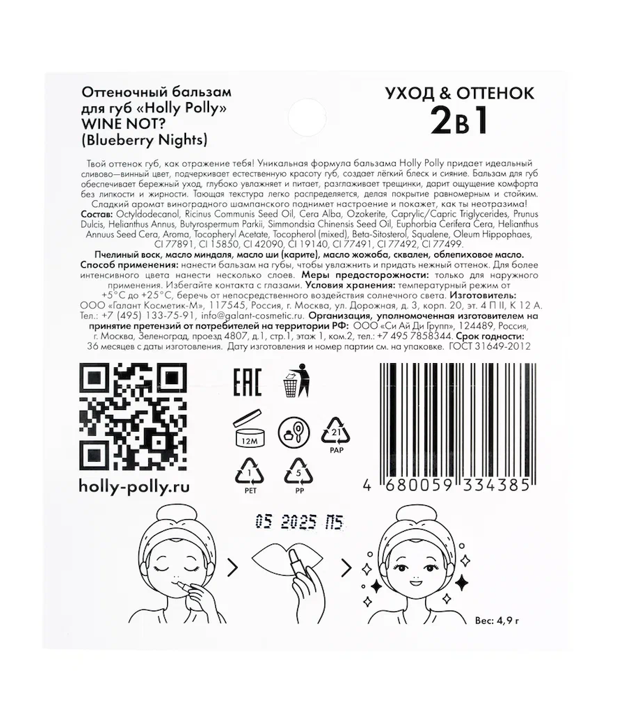 Уникальная формула бальзама Holly Polly придает идеальный сливово-винный цвет, подчеркивает естественную красоту губ, создает лёгкий блеск и сияние.