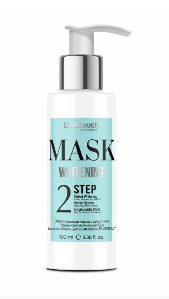 Depiltouch Professional Отбеливающая система: шаг 2. Профессиональная маска-концентрат с арбутином, витамином С, транексамовой, койевой кислотами, нейропептидным комплексом MELANOSTATINE и восстанавливающим комплексом FILAGRINOL - предназначена для системной пролонгированной работы по осветлению гиперпигментации, выравниванию общего тона и микрорельефа кожи.