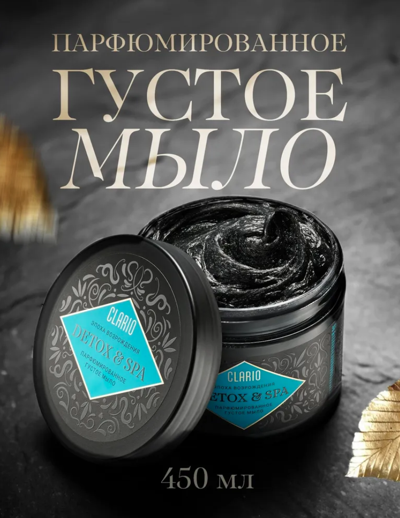 Натуральное очищение и SPA-уход дома. Погрузитесь в атмосферу роскошного спа, не выходя из дома, с густым черным банным мылом DETOX&SPA от CLARIO. Это средство создано для ценителей натурального ухода, сочетающего глубину очищения, бережность и аромат расслабления.