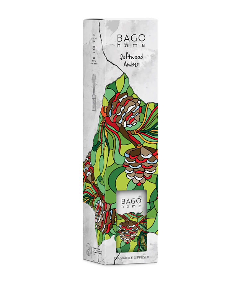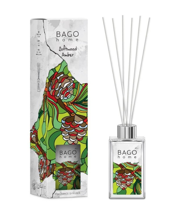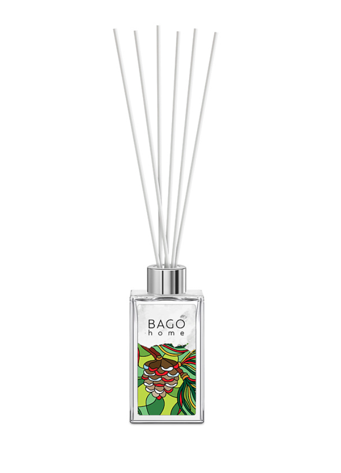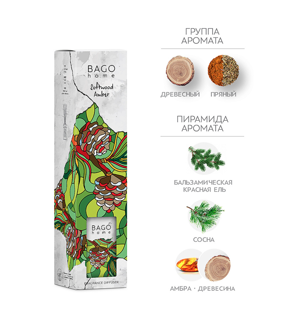 BAGO home Диффузор ароматический Янтарная ель - это благородное сочетание смолистого хвойного аромата еловых иголок, сосновой древесины и липких зеленых шишек, окутанное тёплым амбровым облаком.