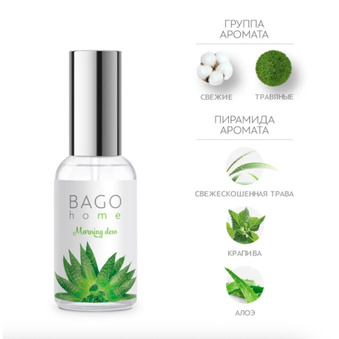 BAGO home Спрей ароматический Утренняя роса - Аромат свежескошенной травы и влажного леса с нотами сочного алоэ и терпкой молодой крапивы.