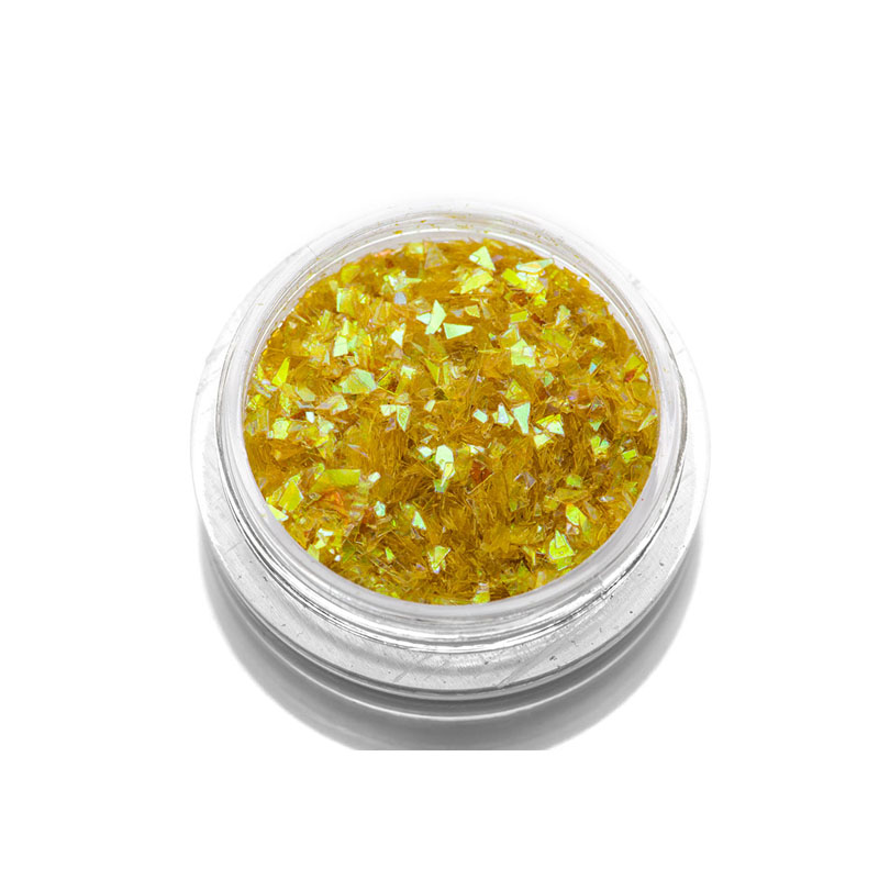 Представляет собой тонкие цветные пластинки или чешуйки напоминающие фольгу. Используется материал для декорирования ногтевой пластины. Слюда может стать как основным элементом в дизайне, так и ярким акцентом. Пластинки наносятся на липкий слой цвета, либо на закрепитель.